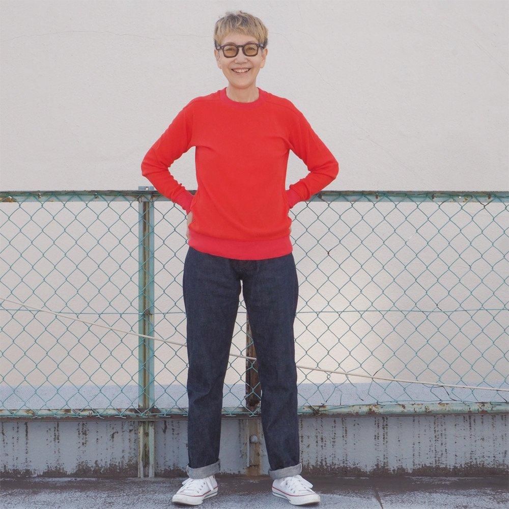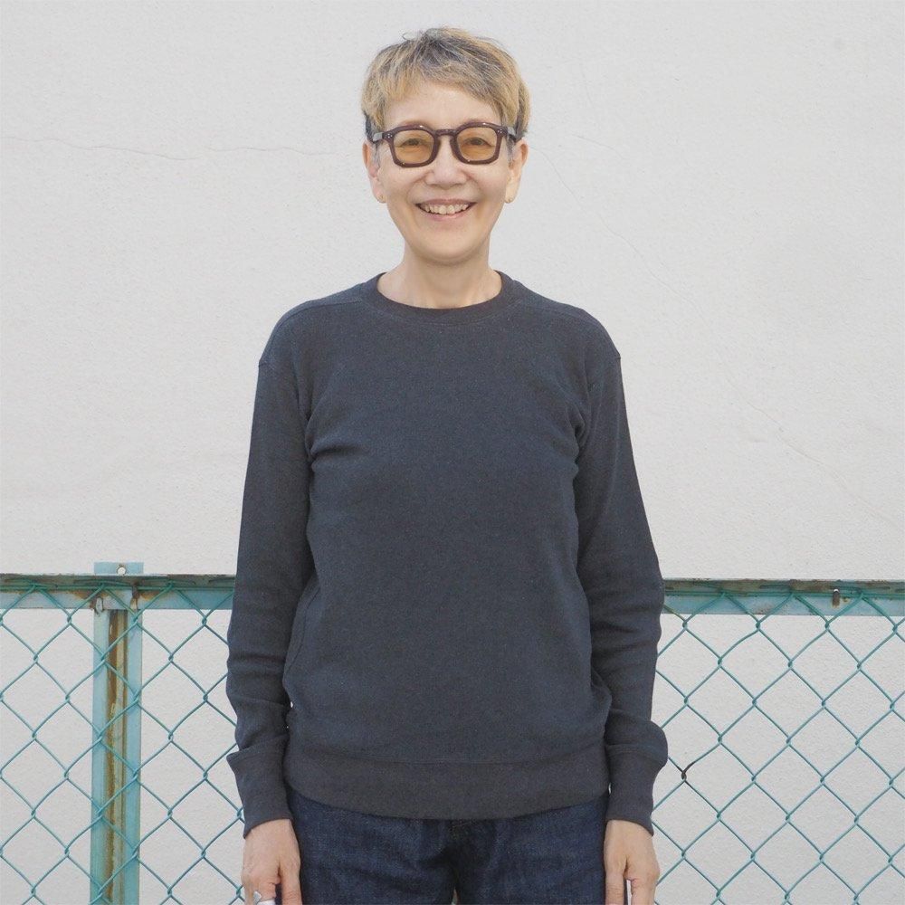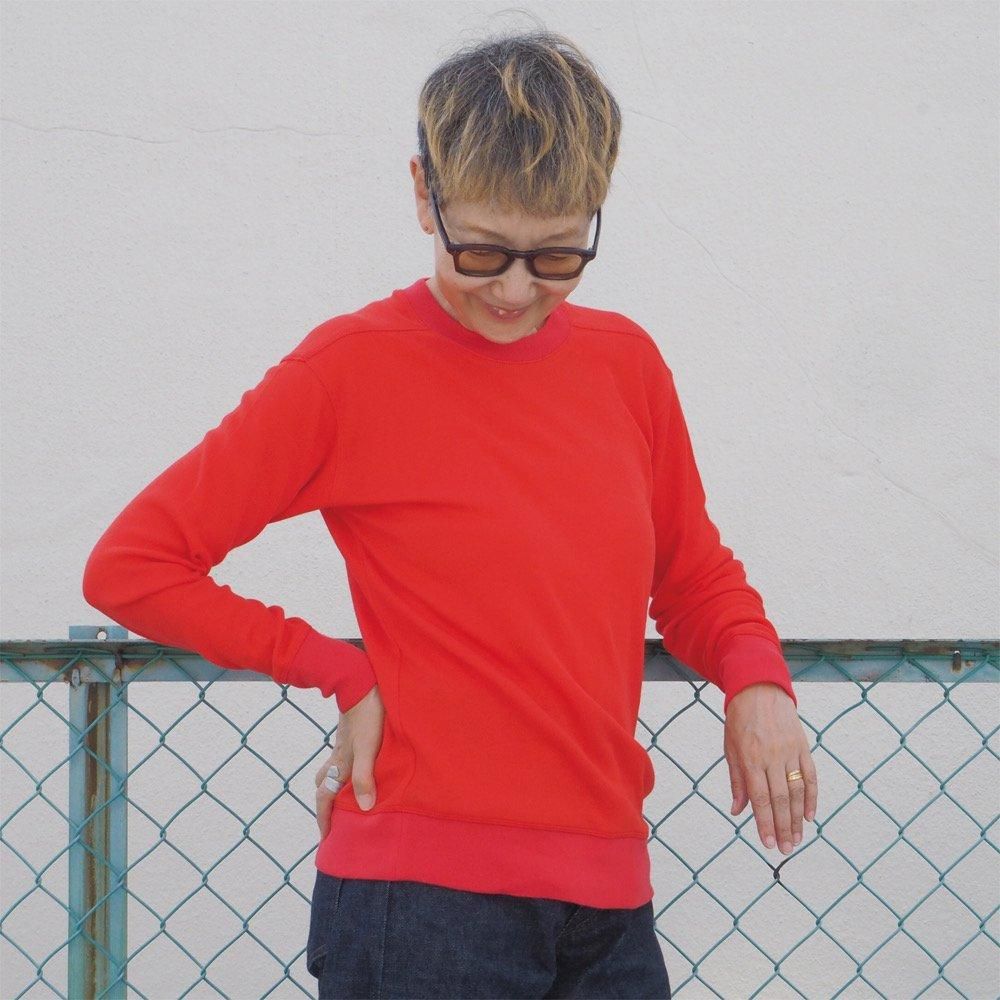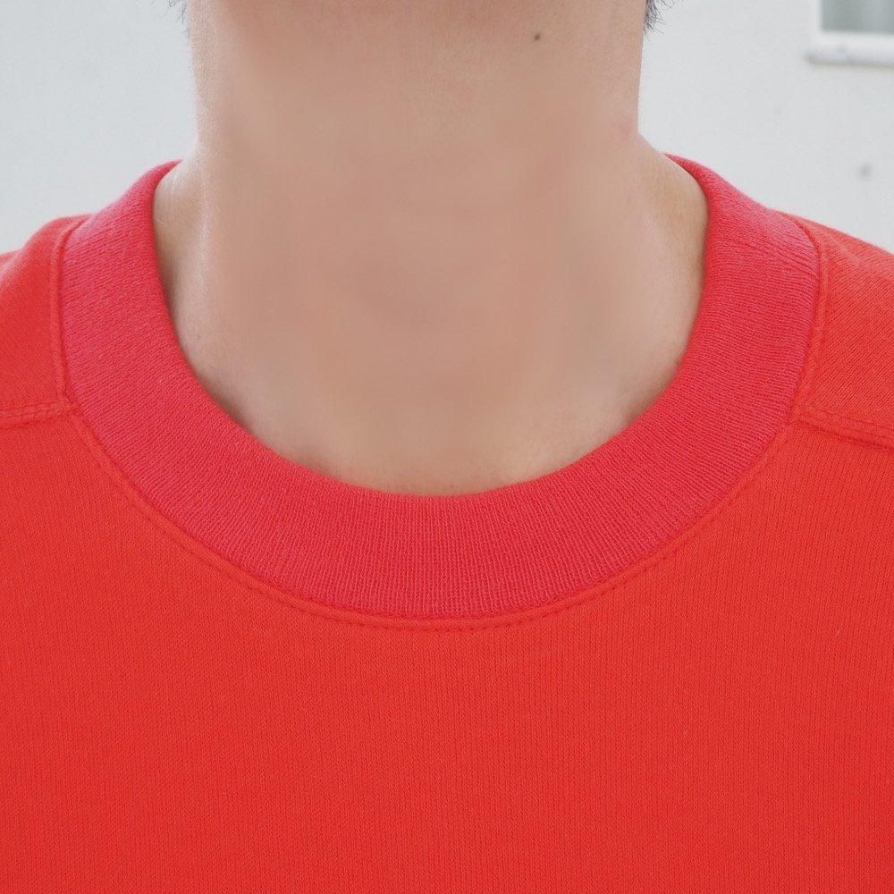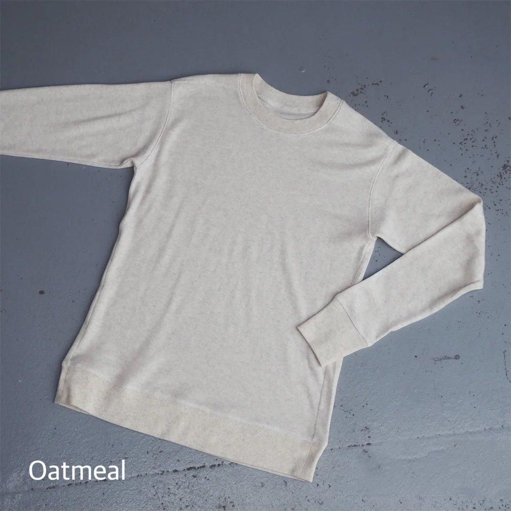 弊社のロングセラーであるこの素材に同素材異ゲージのリブをイチから編み⽴てテンションのかかる裾や袖⼝、襟ぐりに付属として使⽤しました。